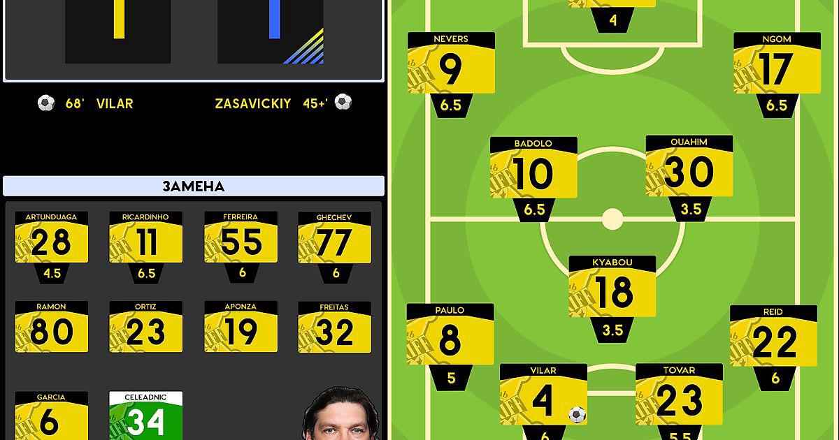 На игру Роман Пилипчук выпустил следующее сочетание игроков: Силич; Пауло, Вилар, Товар, Рид; Киабу, Бадоло, Уаим; Неверс, Мбекели, Аканби.