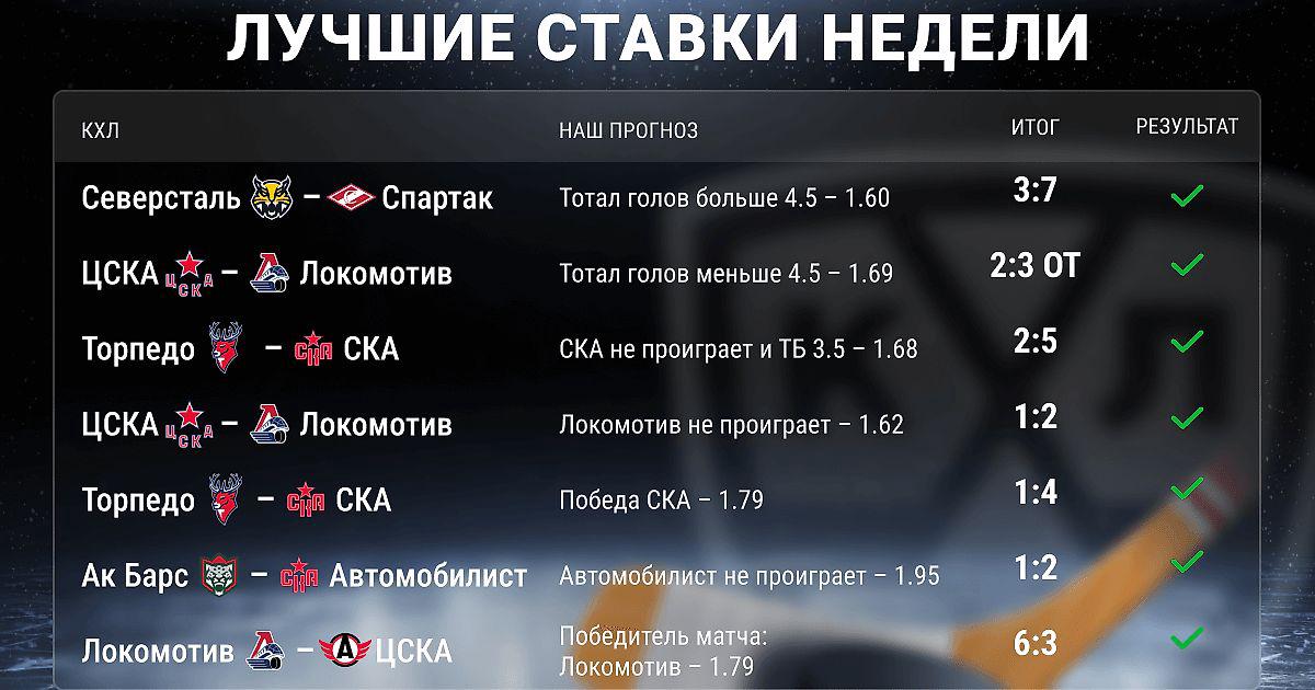 Ну а нашей главной гордостью является триумфальная серия в Кубке Гагарина – абсолютно каждый из 7 подготовленных прогнозов на КХЛ сбылся!
