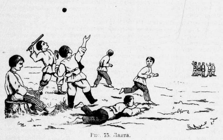 Любопытно, что в «Руководстве по играм без проигрыша» 1880 г., составленном Сергеем Галактионовым, русской лаптой называется версия французской игры «же-де-пом», зародившейся в Древней Греции. Если быть точнее, «русская лапта» здесь приравнена к «игре в городки», в которой две команды в поле пытаются выбить мяч за черту города соперников. Там же «крикет» именуется «английской лаптой».