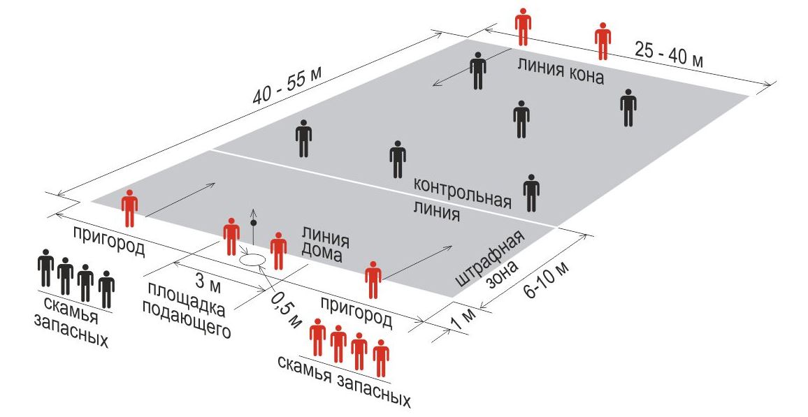 Площадка — прямоугольник размерами 40–50 на 30–40 метров. Лицевая сторона называется «домом» («городом»), противоположная — «коном». Инвентарь — деревянная бита круглого сечения длиной 60–110 см и небольшой резиновый мяч. Участники — две команды (партии) по 6 человек, которые всегда делятся по ролям на защитников и нападающих.