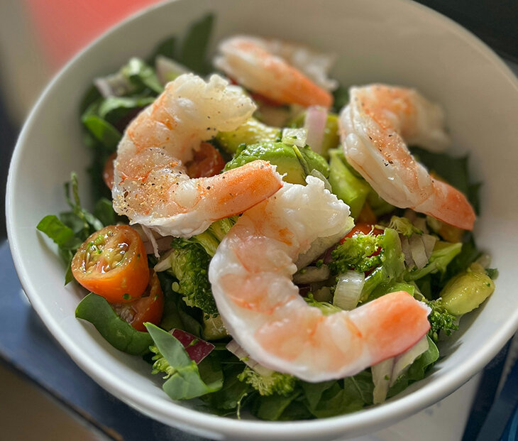 Нарежьте авокадо кубиками, а помидоры черри пополам. В миске смешайте листья салата, авокадо, помидоры и креветки. Заправьте оливковым маслом и лимонным соком, посолите и поперчите. Аккуратно перемешайте и подавайте.