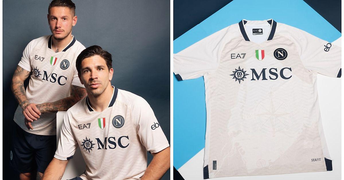 Цвет слоновой кости, морской паттерн, компас, без которого нельзя представить ни одного мореплавателя, а еще сублимированные карты морских портов, в которых останавливаются корабли MSC Crociere за пределами Неаполя: Дубай, Копенгаген и Майами. Каждая футболка имеет свой уникальный номер, а всего их 2023 – в честь чемпионского сезона.