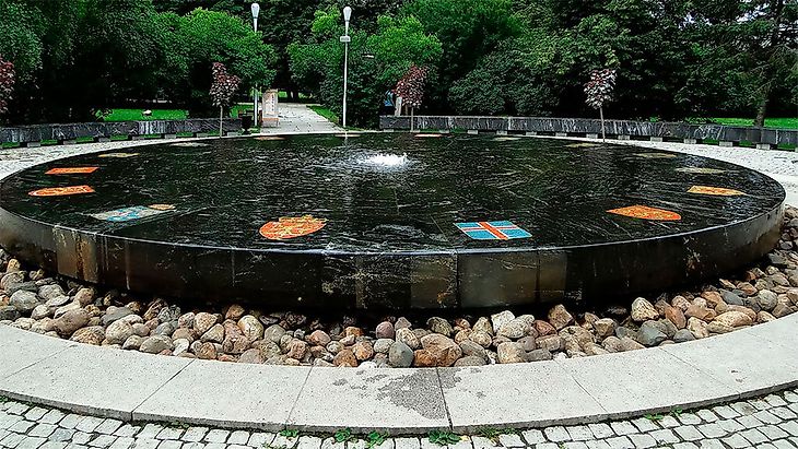 Фонтан представляет собой плоский черный диск, из центра которого вода стекает к краям. По всей окружности фонтана нанесены гербы стран-участниц Ганзейского Союза. Союз функционировал с середины XII века по середину XVII столетия. Русь была членом союза. Активное участие в торговом союзе играл Новгород и Псков, которые вели бурную торговлю. Уверены, что фонтан понравится многим, особенно любителям современной архитектуры и дизайна.