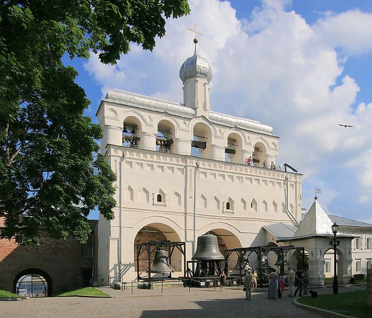 Не только храмы заслуживают внимания на территории Ярославова Дворища. Обратить внимание стоит и на гражданское здание конца XVII столетия – воротная башня Гостиного двора. На протяжении столетий башню называли Вечевой, хотя никаких оснований для такого названия не было.