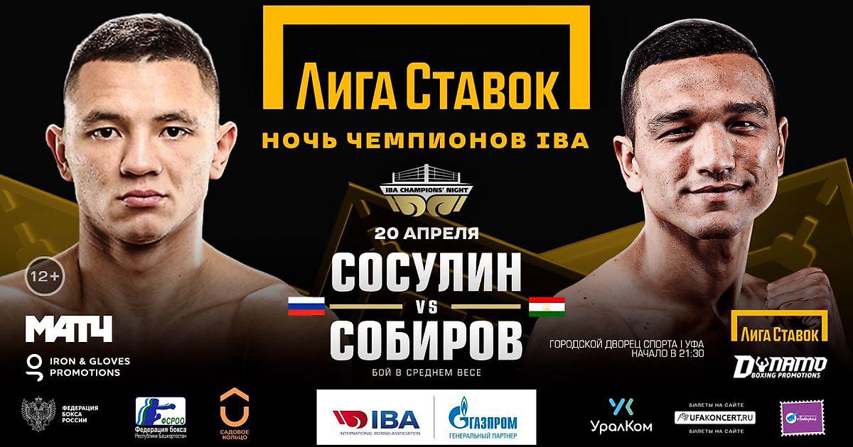 Вечер бокса 20 апреля в Уфе будет организован Международной ассоциацией бокса (IBA) вместе с промоутерскими компаниями Dynamo boxing promotions и Iron&Gloves Promotions. Генеральным партнером мероприятия выступит букмекерская компания «Лига Ставок». В прямом эфире турнир будет показан на телеканале «Матч ТВ», начало трансляции – 21:45 мск. На «Матч! Боец» трансляция начнётся в 19:30 мск.