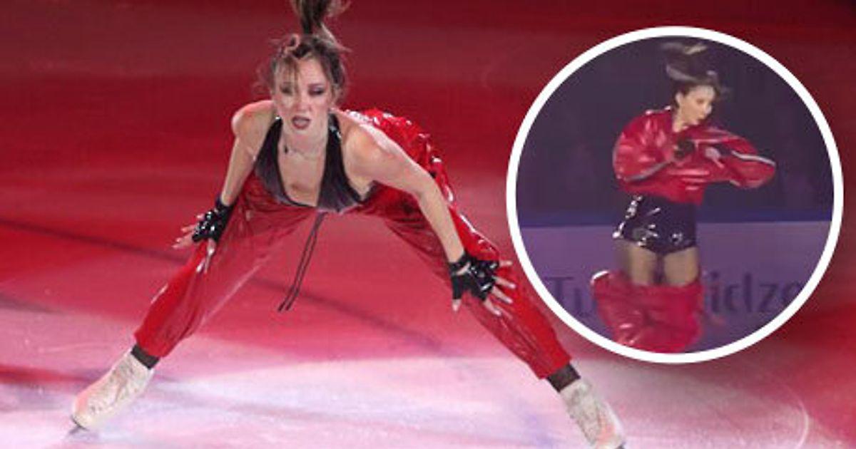 По задумке Лиза снимает красную куртку после вращения – спокойно стоя на льду. А затем резким движением стягивает штаны.