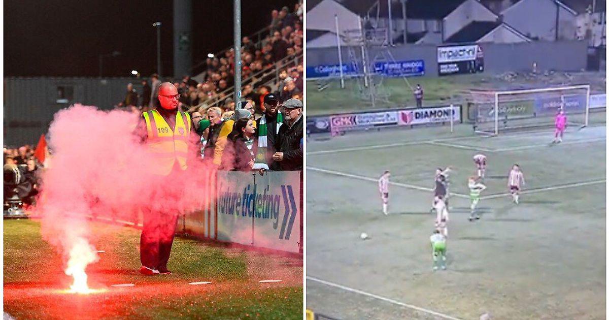 Североирландский «Дерри» играл дома и местным фанатам явно не нравился тот факт, что их команда за второй тайм в течение 13 минут пропустила три гола, а под занавес матча смогла отыграть лишь один. Табло отсчитывало последние секунды до финального свистка, когда игру приостановили из-за горящей пиротехники.