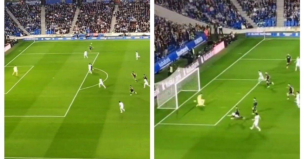 Сегодня ночью полузащитник «Реала» впервые вышел в стартовом составе на игру чемпионата Испании и на 29-й минуте замкнул прострел защитника Даниэля Карвахаля. Вот как этот гол выглядел с трибун.