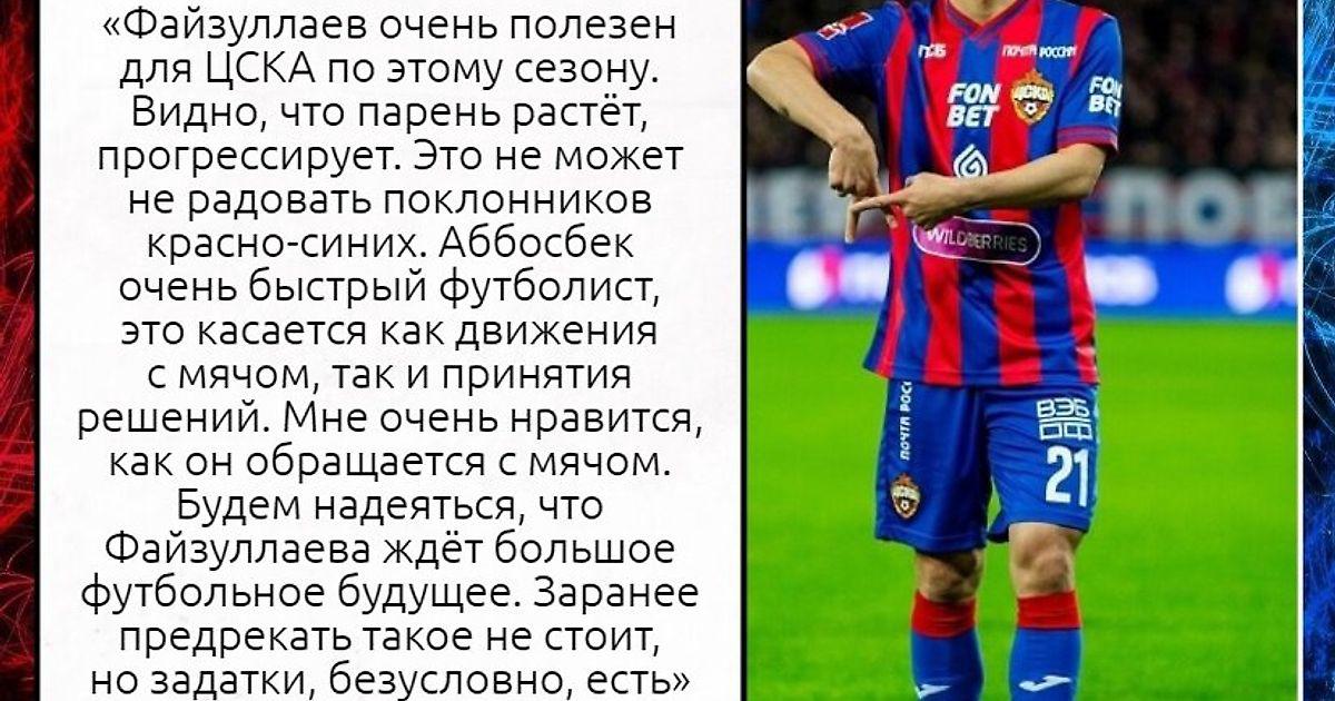 Экс-тренер вратарей ЦСКА Вячеслав Чанов в разговоре с Legalbet высказался об игре хавбека армейцев Аббосбека Файзуллаева. «Файзуллаев очень полезен для ЦСКА по этому сезону. Видно, что парень растёт, прогрессирует. Это не может не радовать поклонников красно-синих. Аббосбек очень быстрый футболист, это касается как движения с мячом, так и принятия решений. Мне очень нравится, как он обращается с мячом. Будем надеяться, что Файзуллаева ждёт большое футбольное будущее. Заранее предрекать такое не стоит, но задатки, безусловно, есть», — сказал Чанов корреспонденту Legalbet. В нынешнем сезоне Файзуллаев сыграл за ЦСКА 26 матчей во всех турнирах, забил четыре гола и отдал 11 результативных передач. Transfermarkt оценивает стоимость 20-летнего узбекского полузащитника в 5 млн евро.