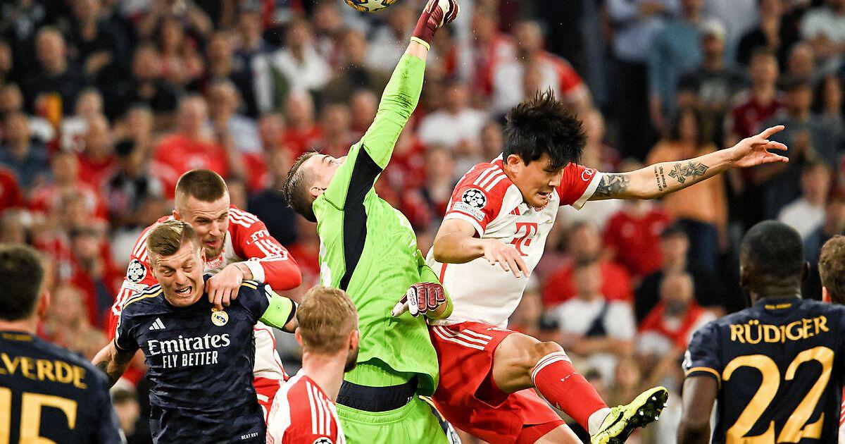 В первые 20 минут Бавария полностью забрала себе мяч(хотя на подкасте с Ярославом Куприковым я утверждал обратное, что наоборот Реал больше будет владеть мячом), и Реал располагался схемой 4-4-2 с Вини и Беллингемом как двумя оборонительными форвардами, Родриго соответственно опускался ниже и становился левым полузащитником, место справа же занимал Феде Вальверде. Это было очень грамотное построение в защите от Мадридцев, и позже они всё-таки завладели мячом. Первый гол, первый момент у Реала в принципе в игре показал бездисциплинированность оборонительной линии Баварии. Два рывка Вини в сторону Крооса, который находился с мячом, заставили Ким Мин Джэ выдвинуться за бразильцем и тем самым он уже потерял свою позицию, тогда и образовался большущий коридор между корейцем Кимом и Дайером, куда Тони и исполнил шикарный пас(для него это как щёлкать орешки для белки). Забегание Винисиуса за Джэ и вот он гол. После забитого мяча сливочные уже больше контролировали мяч, нежели в первые 20 минут встречи. После первой половины игры было очевидно то, что план Карло Анчелотти работал лучше, чем план Тухеля.