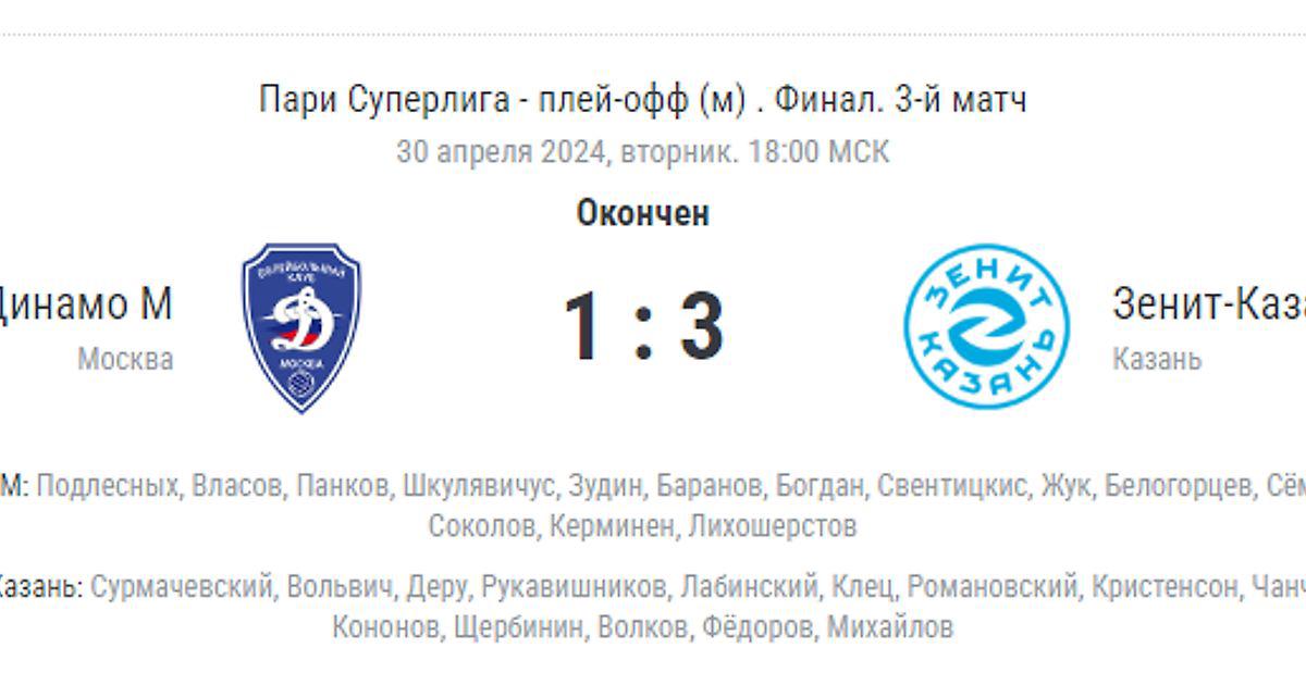 Третий матч финальной серии российской волейбольной Суперлиги между московским «Динамо» и «Зенитом-Казань» завершился победой казанцев со счётом 3:1 (25:20, 25:22, 17:25, 25:20). «Зенит-Казань» выиграл финальную серию со счётом 3-0 (3:0, 3:1, 3:1) и стал чемпионом России сезона-2023/2024.