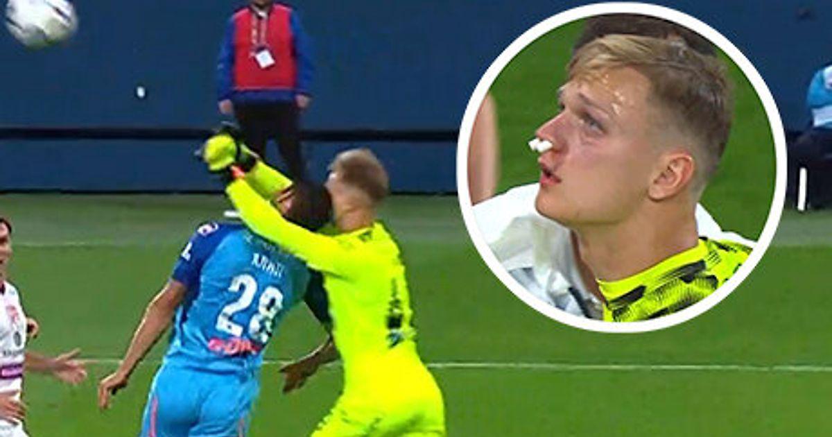 Он играл на выходе при штрафном «Зенита», на мяч еще шел защитник Нуралы Алип – столкновение.