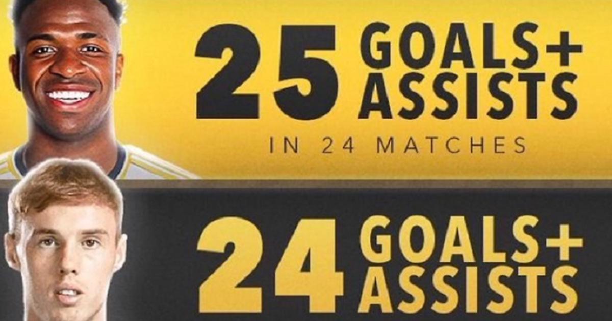 Сейчас у Палмера 32 результативных балла (22+10), у Винисиуса - 34 (23+11). При этом Палмеру осталось провести 1 матч в в АПЛ, а бразильцу 3 - два в Ла Лиге и финал ЛЧ.