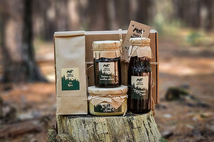 В продаже есть наборы под названием «Тайга внутри» и под другими брендами. В зависимости от желаний покупателя внутри может оказаться варенье и сиропы из лесных ягод, варенье из молодых шишек, мед с чагой и кедровыми орешками, лесной иван-чай, наполненный разнообразными травами и ягодами, натуральный кедровый орех и другие съедобные припасы из леса.