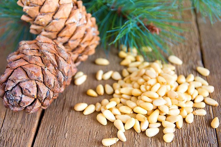Кедровые орехи — один из главных деликатесов русской тайги. Орехи не имеют отношения к кедрам и являются плодами сибирской кедровой сосны. Орешки «спрятаны» в шишках, откуда из выбивают специальными приспособлениями. У ядер сосны приятный вкус, в них большое содержание масла, аминокислот, сахарозы, крахмала, витаминов и других полезных веществ.