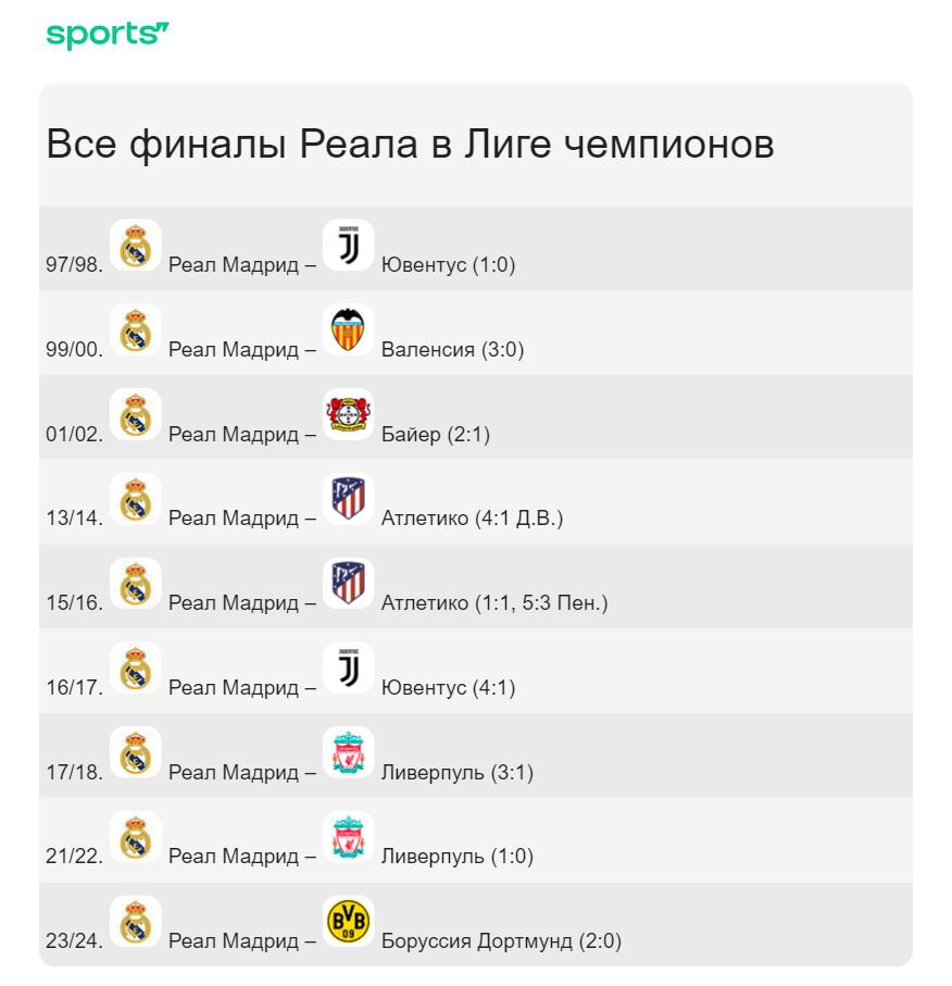 В Лиге чемпионов клуб никогда в финалах не проигрывал. «Боруссия» пополнила коллекцию жертв Мадрида: девять решающих матчей – девять побед.