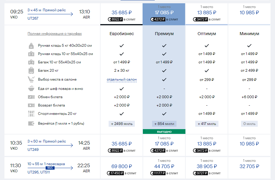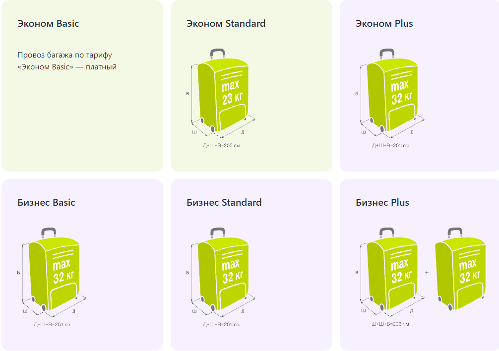 Услуга по покупке дополнительного места предоставляется и для транспортировки животных. При этом есть ограничение по весу контейнера с питомцем не более 15 кг и габаритов 50х40х40 см для Бизнес класса и 50х35х32 см для Комфорта и Эконома.