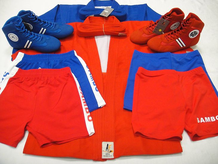 Как и у других единоборств в самбо предусмотрена специальная экипировка. Она состоит из куртки красного или синего цвета, коротких шорт, пояса, защитного бандажа для защиты паха у мужчин, закрытого купальника для женщин. Также используется специальная обувь «самбовки». Последние напоминают ботинки с мягкой подошвой без визуально выступающих твердых частей. Специальные прокладки защищают стопу и щиколотки.
