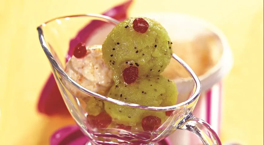 Приготовление: перемешайте сахар и воду. Кипятите, пока сахар не растворится. Уберите с огня и остудите. Смешайте сахарный сироп с пюре киви и лимонным соком. Вылейте смесь в контейнер и заморозьте на несколько часов. Каждые 30 минут перемешивайте смесь вилкой, чтобы разбить кристаллы льда. Подавайте киви-граните охлажденным.