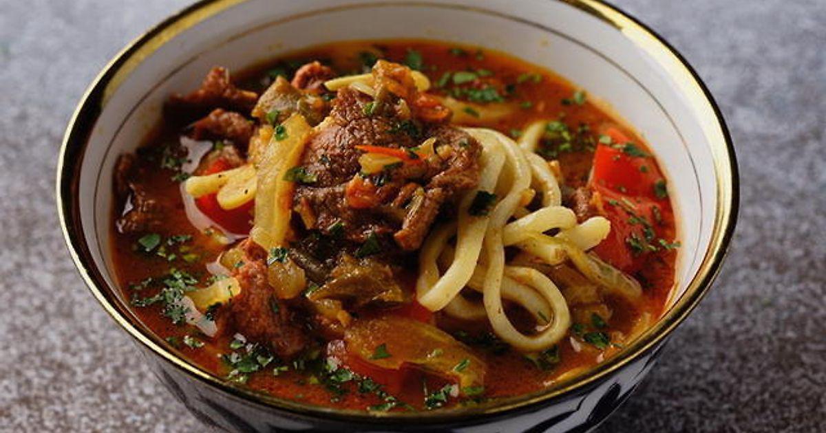 Этот вариант лагмана с говядиной насыщен вкусом благодаря обилию специй и овощей.