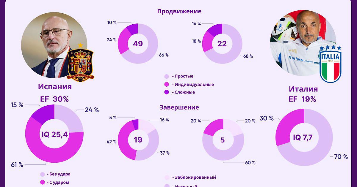 Итальянцы провели не лучшую игру. 19% эффективности – один из слабейших показателей на турнире. Первый тайм просто катастрофа: при общем 3,1 IQ иметь эффективность в 10% — это эпизодическая игра в футбол. Очевидно, что значение IQ команды заметно упало (на 53%) по сравнению с первой игрой, тогда как у испанцев оно выросло на 37%.