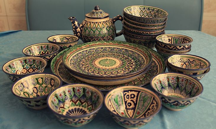Если вы окажетесь в Казахстане у кого-нибудь в гостях, то для вас обязательно накроют стол. Обратите внимание на посуду, чаще всего она будет из керамики. Во-первых, оригинально, во-вторых, очень удобно. Приобрести керамические изделия можно в лавках местных мастеров, на рынках и в магазинах. Большинство изделий украшаются национальными орнаментами, так что в качестве сувенира из Казахстана очень подойдут.