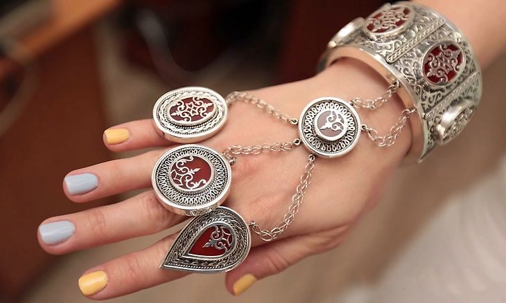 Если хотите приобрести серебряное изделие именно с национальной тематикой, то обратите внимание на саукеленин сыргаса, так называют подвески к головному убору невесты, о котором мы рассказывали выше. Продаются серьги в виде больших монет — шолпы. Считается, что они могут приносить достаток и счастье в дом владелицы. Особой популярностью у жительниц Казахстана пользуются большие широкие браслеты билезик, которые можно носить как на запястье, так и на лодыжке. Конечно же, каждое такое изделие украшается национальными орнаментами. Обратим внимание мужчин на то, что подобное украшение всегда будет отличным подарком для женщины.