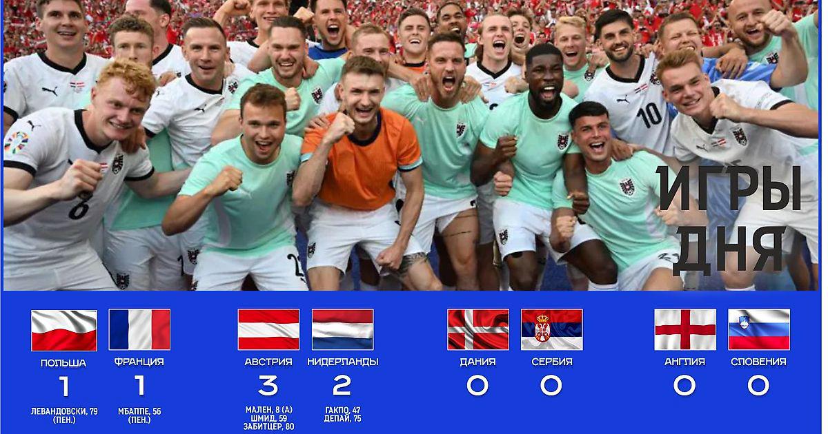 Нидерланды - Австрия 2:3 Гакпо (Симонс), 47; Депай (Вегорст), 75 - Мален, 6 (А); Шмид (Гриллич), 59; Забитцер (Баумгартнер), 80.