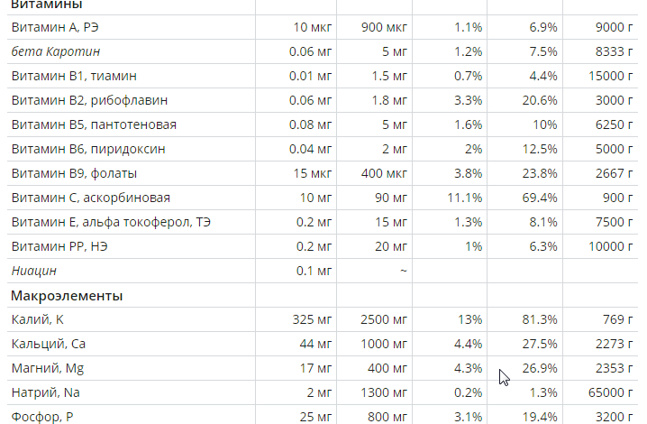 Больше всего в 100 граммах содержится воды – 93,61 грамма. Из приведенной ниже таблицы можно увидеть, каких витаминов, макро и микроэлементов больше всего находится в продукте, а также просмотреть норму для организма в сутки этих элементов. Для чего нужна эта информация? Знать химический состав продуктов надо обязательно, чтобы сбалансировать свой рацион и в течение дня получить достаточное количество витаминов и минералов.