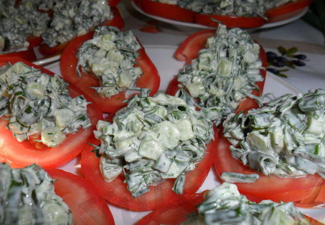 Способ приготовления. Все ингредиенты перемыть, обсушить на полотенце. Томаты порезать кружочками. Мелко измельчить лук и укроп. Смешать лук и укроп с майонезом. При необходимости добавить соль. Помидоры выложить на красивое блюдо, а сверху положить смесь лука и укропа с майонезом. Украсить листьями салата и петрушкой. Подавать в качестве закуски.