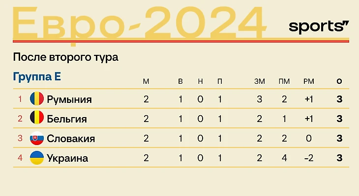 Румыния сейчас выше Бельгии за счет большего количества голов (3 vs 2), а Словакия выше Украины благодаря разницей мячей (0 vs -2).