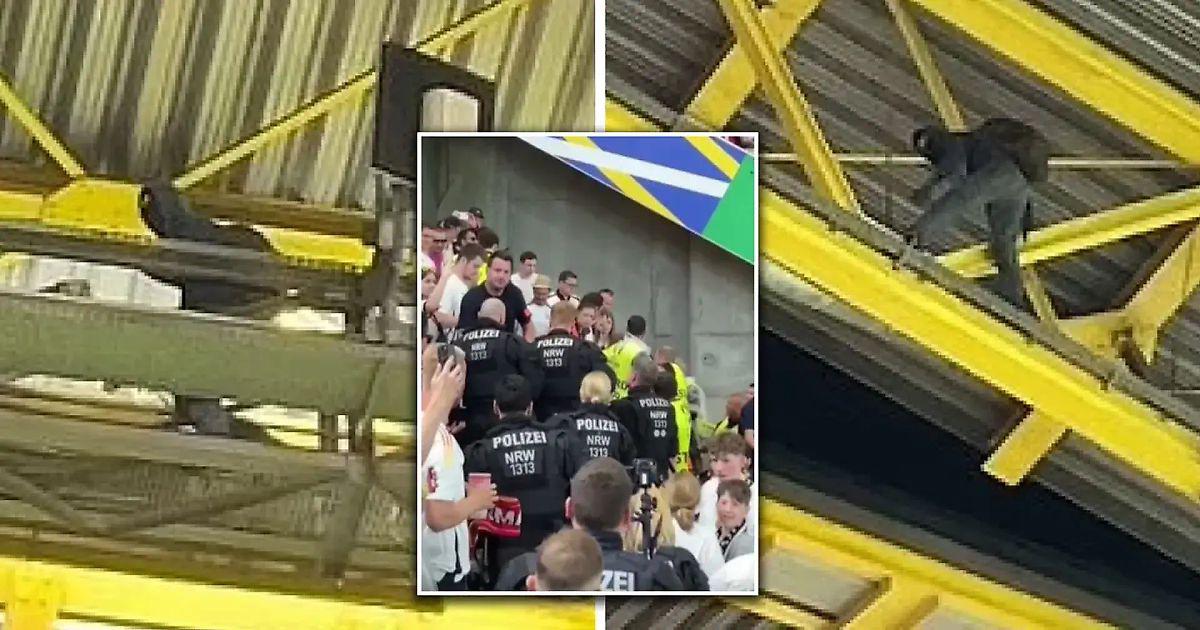 🤯 Безумие в Дортмунде. Помимо молний, на матче Германия – Дания произошел еще один инцидент: неизвестный в маске убегал от вооруженной полиции по стропилам стадиона 😨