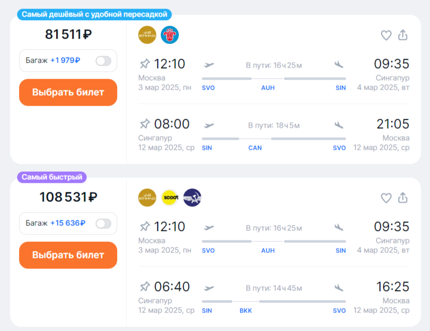 Прямых рейсов между российскими аэропортами и Сингапуром нет. Большинство туристов летают через Китай (Шэньчжэнь и Гуанчжоу), либо через Абу-Даби и Бангкок.
