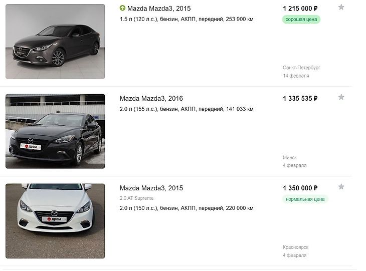 У двигателя 1,6 литра простая конструкция и он надежен, но при езде будет слабая динамика. Лучше предпочесть двигатели SkyActiv, которые в эксплуатации не доставят сильных хлопот. За обозначенный бюджет найти Mazda 3 будет не так просто. Больше предложений с движками SkyActiv. Стоимость авто от 1 200 000 – 1 300 000 рублей.