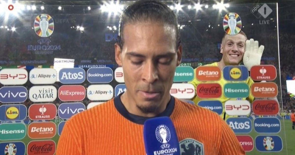 После матча вратарь англичан зачем-то влез в кадр, когда интервью давал капитан голландцев и «Ливерпуля» Вирджил ван Дейк.