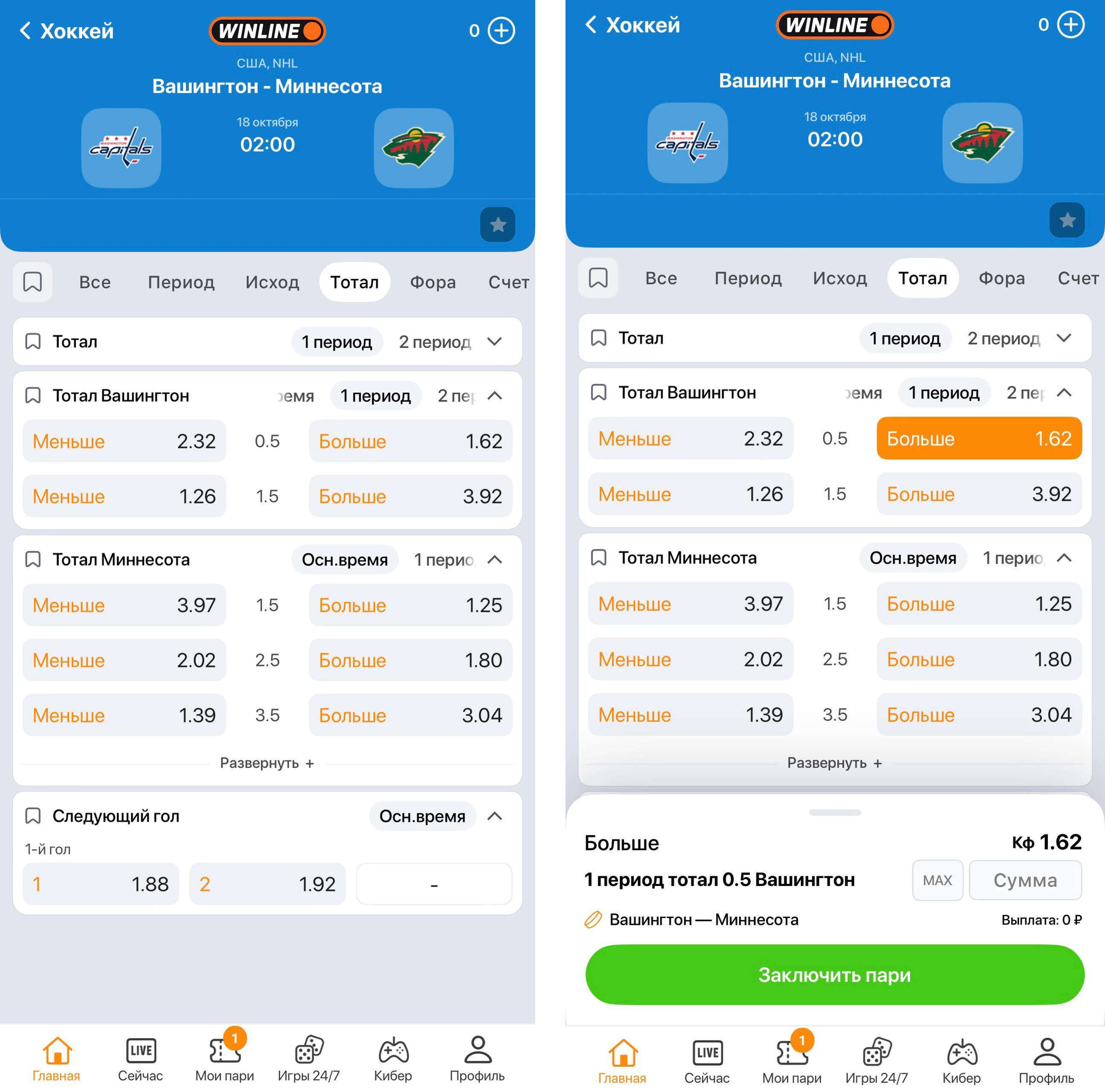 В хоккее результативность матчей выше, поэтому ставка на ТБ 0,5 матча встречается крайне редко. Ее могут добавить в роспись в формате лайв, если игра идет без заброшенных шайб. Чаще встречается пари на ТБ 0,5 конкретной команды или гол в рамках одного периода.