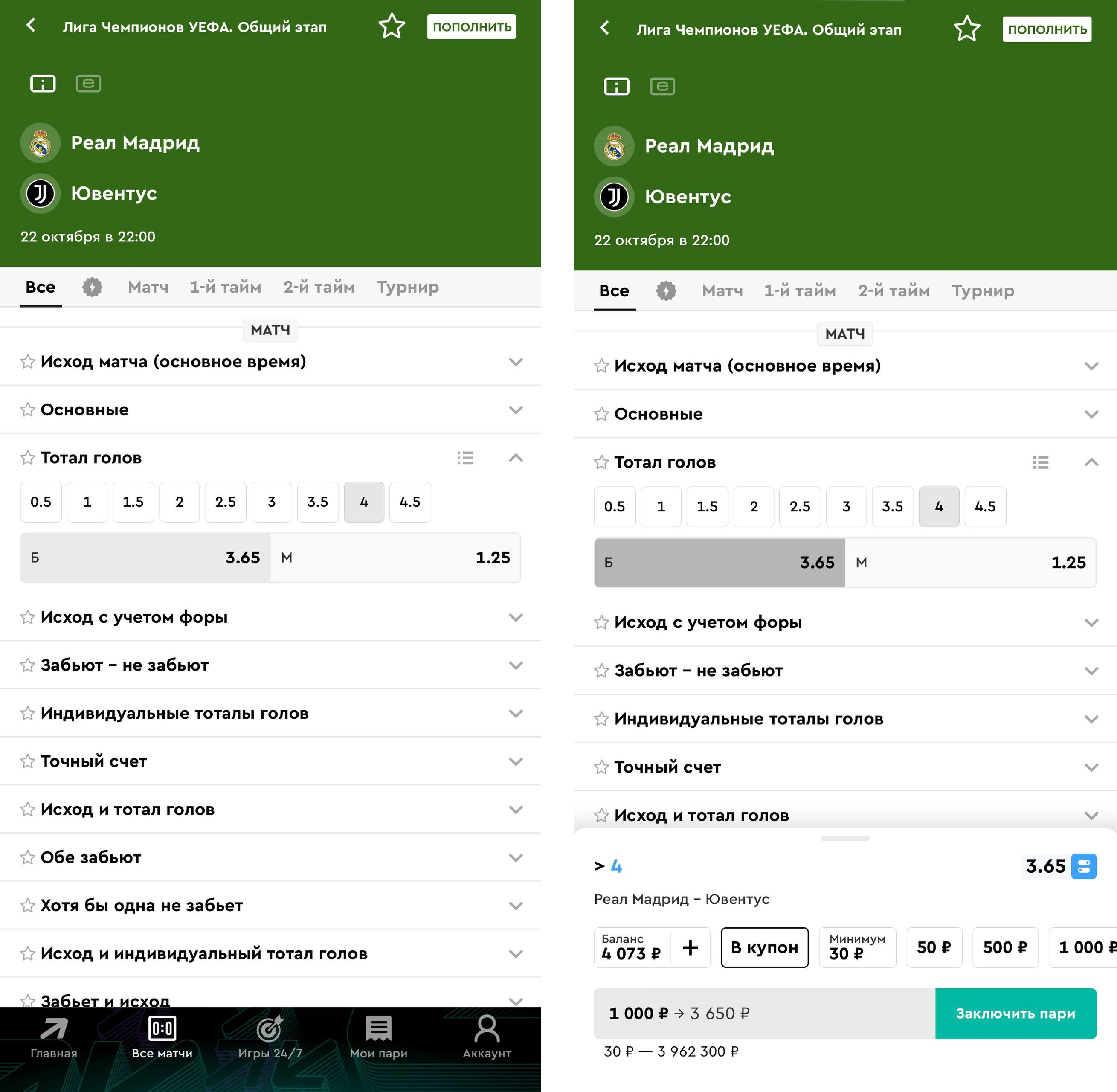В live-ставках кэфы могут меняться в зависимости от текущего хода матча. Если в начале матча забивается несколько голов, коэффициенты могут снижаться, так как вероятность достижения более четырех голов возрастает. Соответственно, если первая половина матча проходит без голов, коэффициенты на тотал больше 4 могут значительно увеличиться, доходить до 6-7.