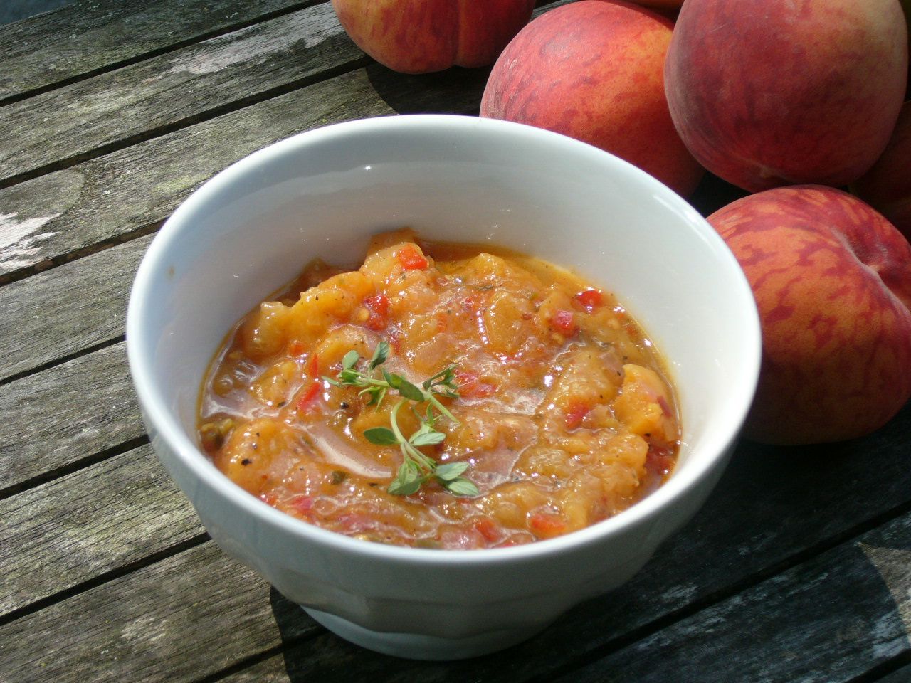 Это пикантное индийское блюдо, которое прекрасно сочетается с мясом или сыром. Для его приготовления нарежьте персики кубиками и обжарьте их на сковороде с добавлением лука, чеснока, имбиря и специй (куркумы, кориандра, тмина). Добавьте немного уксуса и сахара, и томите на медленном огне до загустения. Такой чатни можно подавать как в горячем, так и в холодном виде.
