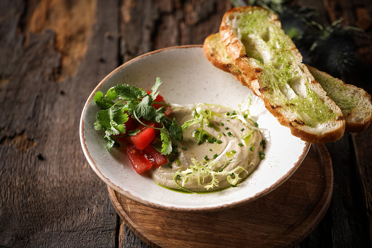Баклажаны запекаются целиком до мягкости, затем мякоть измельчается и смешивается с тахини, лимонным соком, чесноком и оливковым маслом. Получается кремообразная паста с дымным ароматом, которую подают с питой или свежими овощами.