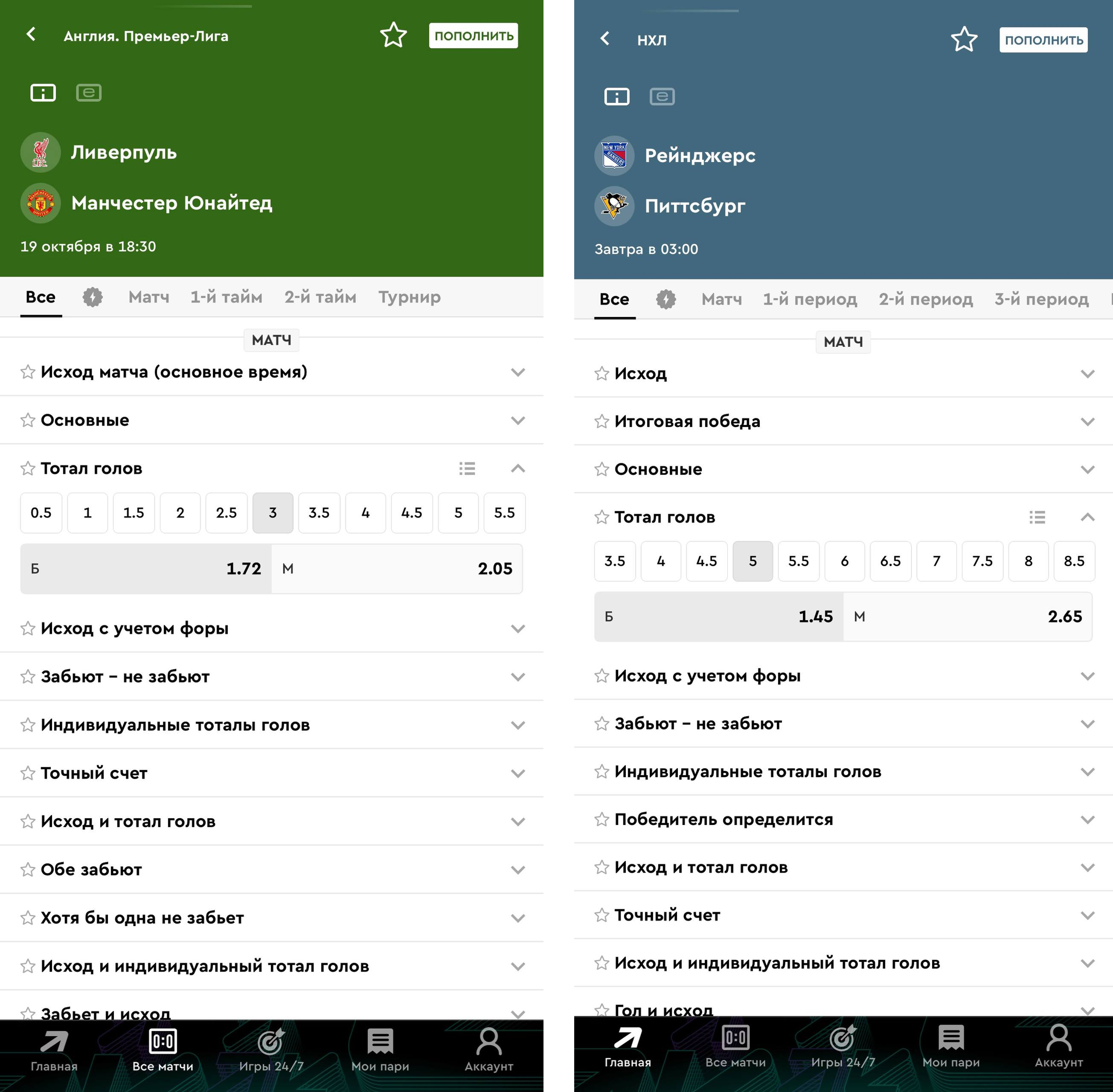 В росписи спортивных событий представлены два основных вида ставок на ТМ:
