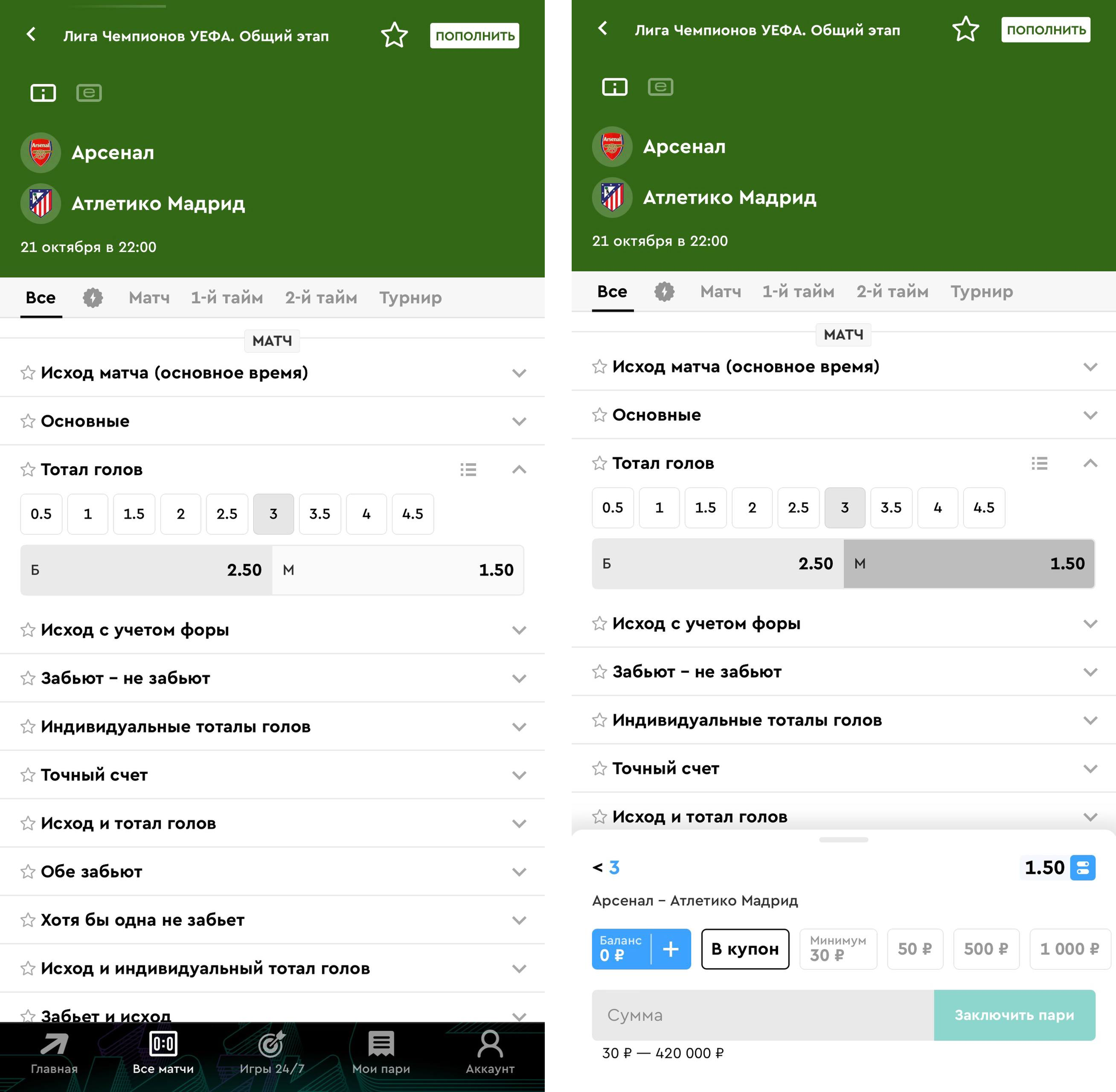 Пример расчета ставки 1000 рублей на ТМ 3 на основе матча Лиги чемпионов между «Арсеналом» и «Атлетико»: