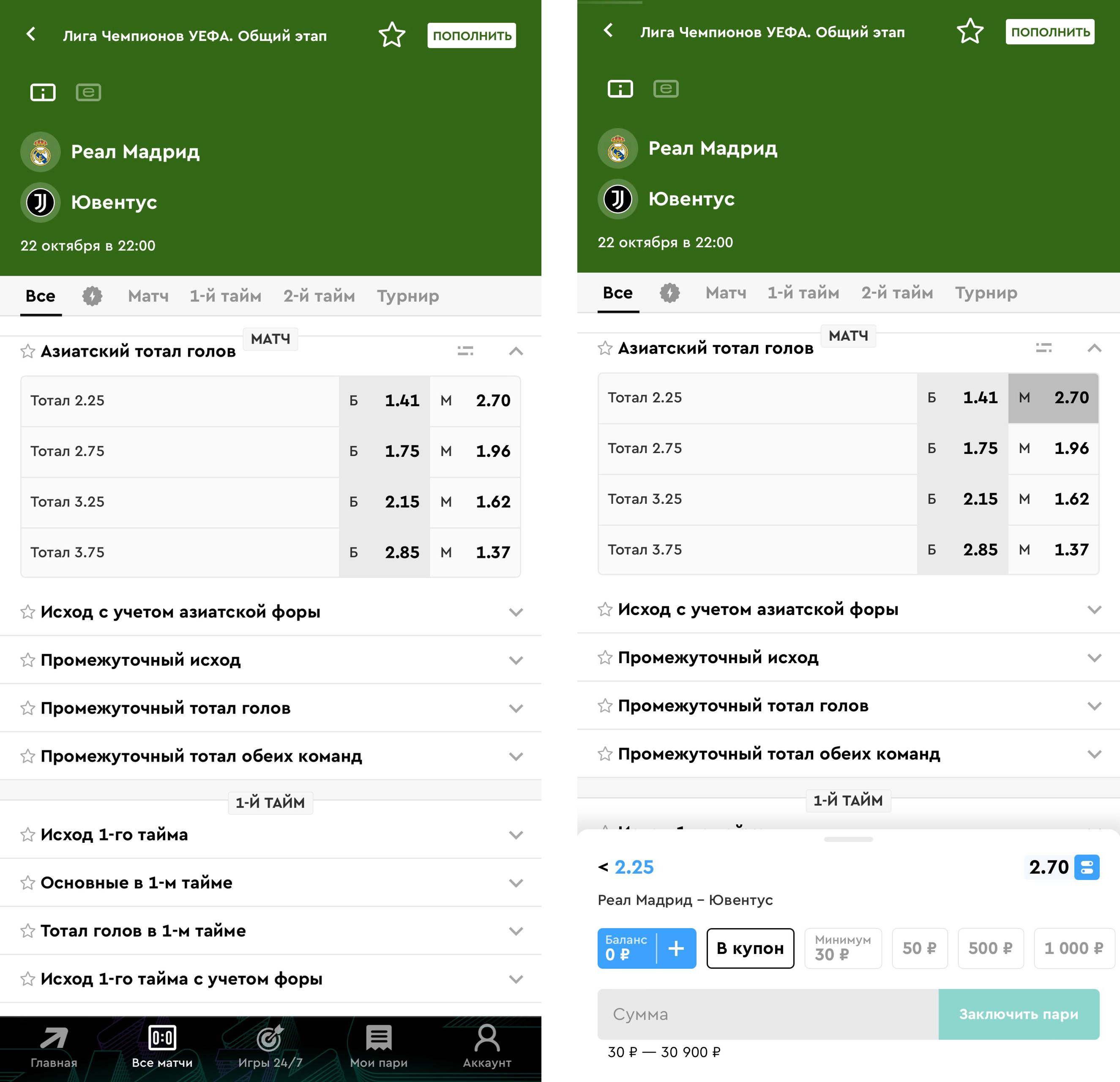 Возьмем пример матча «Реал» — «Ювентус». Сумма ставки — 1000 рублей, ставим на ТМ 2,25 голов в матче. В этом случае 500 рублей идет на ТМ 2; оставшиеся 500 — на ТМ 2,5. Посмотрим сколько можно выиграть: