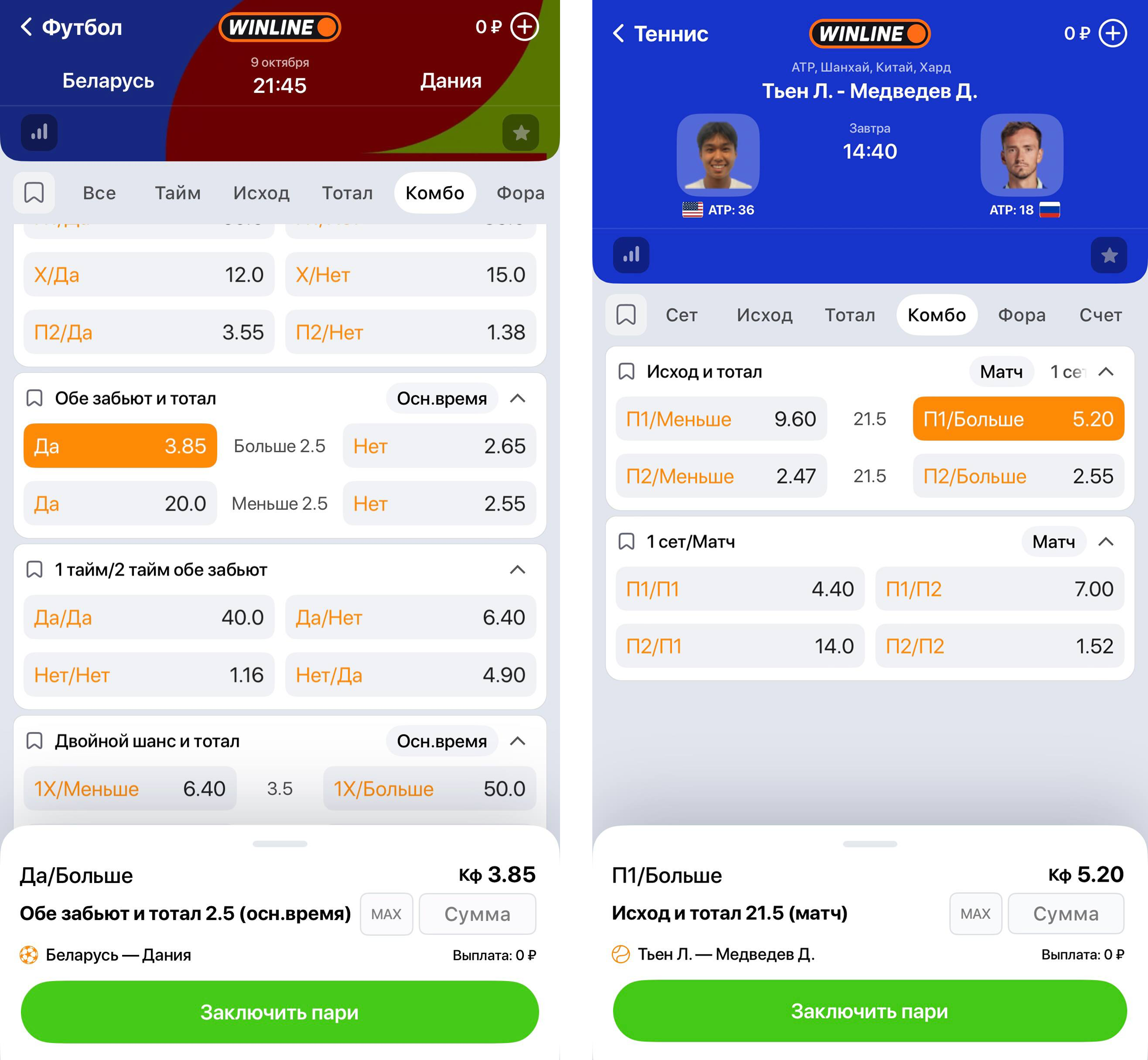 - ТМ 4,5 и «обе забьют — да» – в футболе;