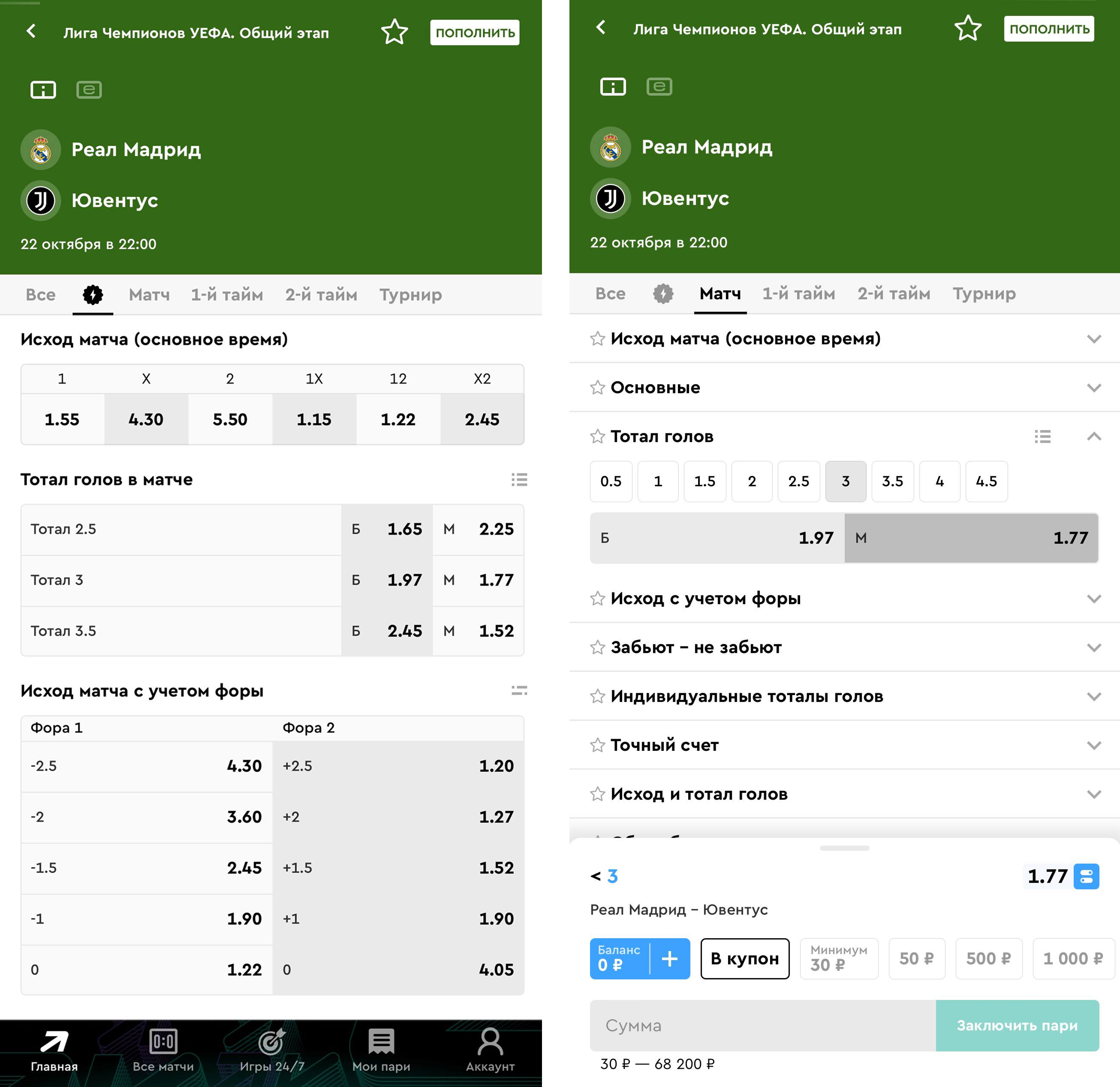 Рассмотрим на примере футбольного матча между «Реалом» и «Ювентусом» в ЛЧ. В линиях букмекеров можно найти тотал меньше или больше с самыми разными показателями. Но наше внимание приковано к ТМ 3.