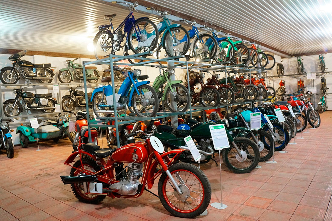 В экспозиции так много мотоциклов и мопедов, что они с трудом умещаются в небольшом помещении. Основу экспозиции составляют отечественные модели «Днепр». «Урал», «Минск», есть иностранная техника. Экскурсию проводит сам создатель музея, поэтому вы получите информацию из первых уст.