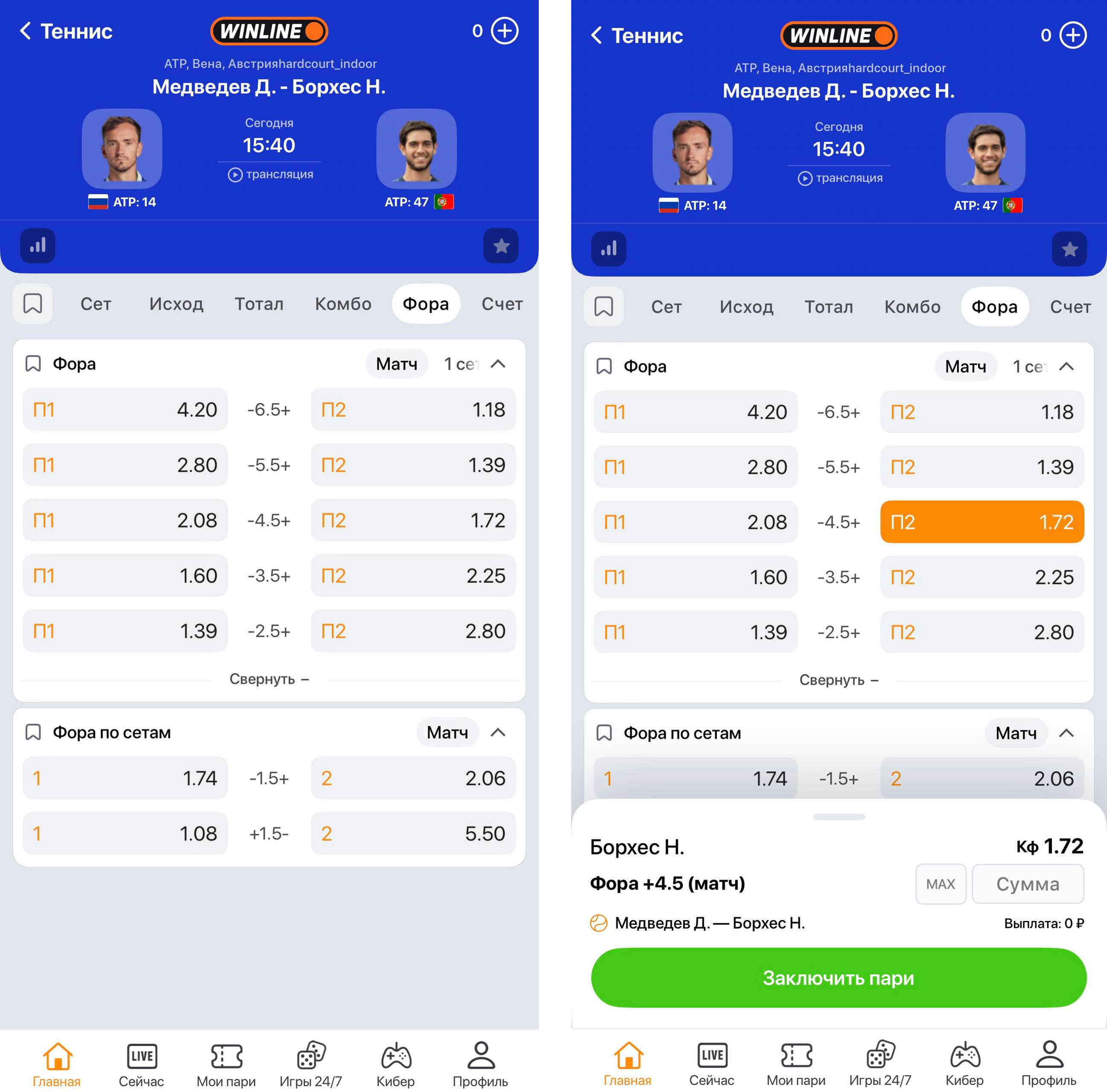 Чтобы понять, как работает ставка на Ф2 -4,5 возьмем матч Медведев — Борхес, допустим счет встречи 6:4, 6:4. После сложения выигранных геймов получим 12:8. Если ставить на Ф2 +4,5, то из итогового счета необходимо вычесть размер форы и получаем 12:12,5. Преимущество остается на стороне Борхеса, ставка выиграла.