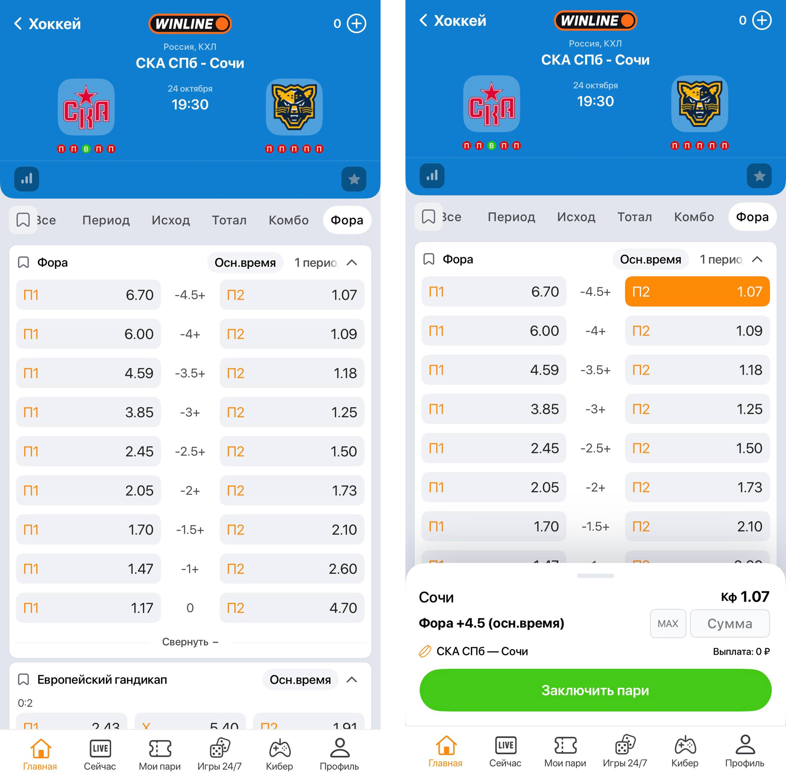 Для расчета пари Ф2 +4,5 обратим внимание на матч КХЛ СКА — «Сочи». На победу «Сочи» с преимуществом +4,5 предлагают коэффициент 1.07. При ставке в 1000 рублей выигрыш составит 1,07 х 1000 = 1070 рублей. По итогам матча доступны два варианта расчета пари: