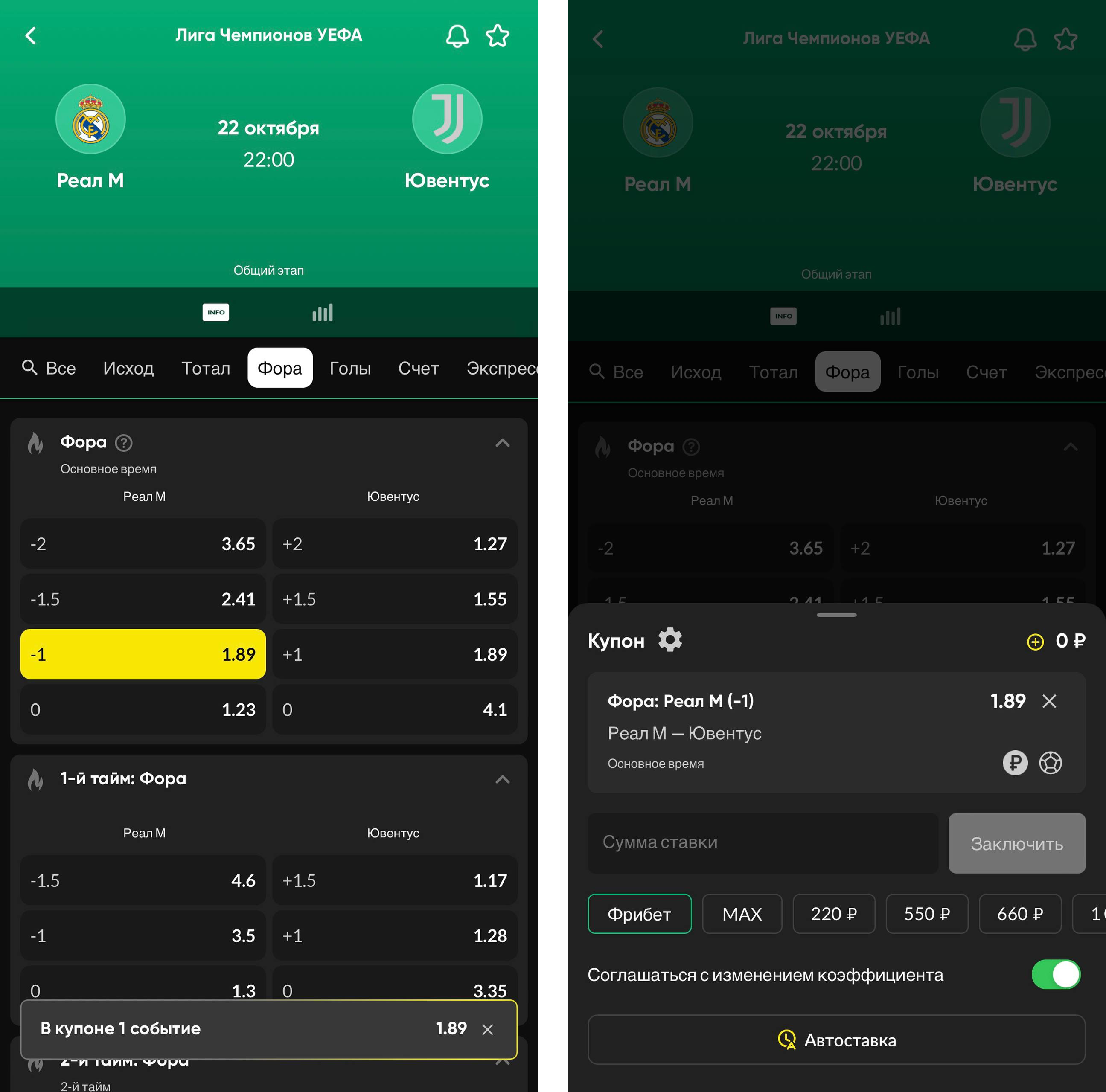 В том же поединке между «Реалом» и «Ювентусом» игрок ставит 1000 рублей на Ф1 (+1) с коэффициентом 1.20. Варианты расчета ставки: