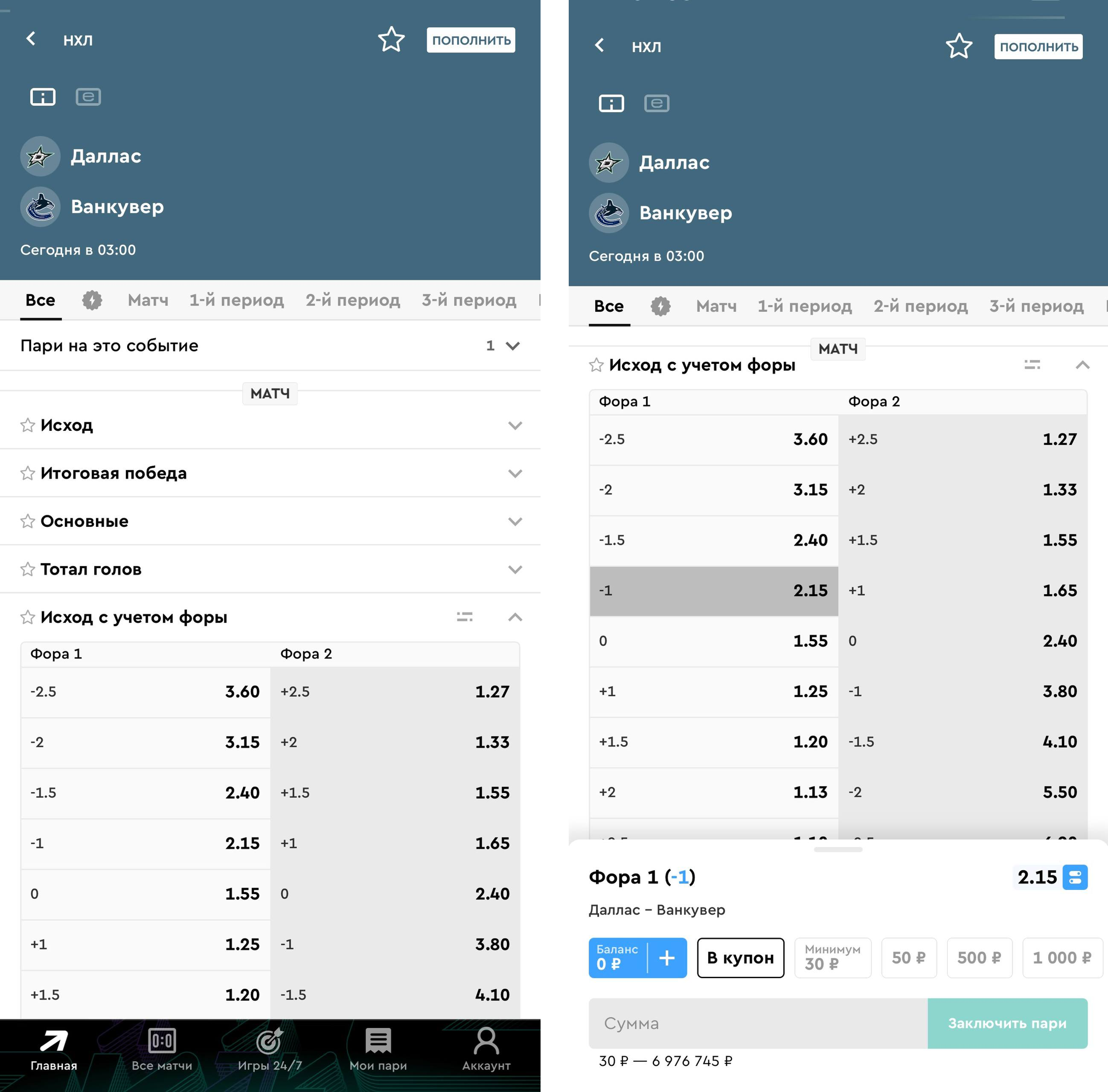 Пример. В матче НХЛ «Даллас» — «Ванкувер» игрок делает ставку на Ф1 (-1) с коэффициентом 2.15 в размере 1000 рублей. Как будет рассчитываться пари:
