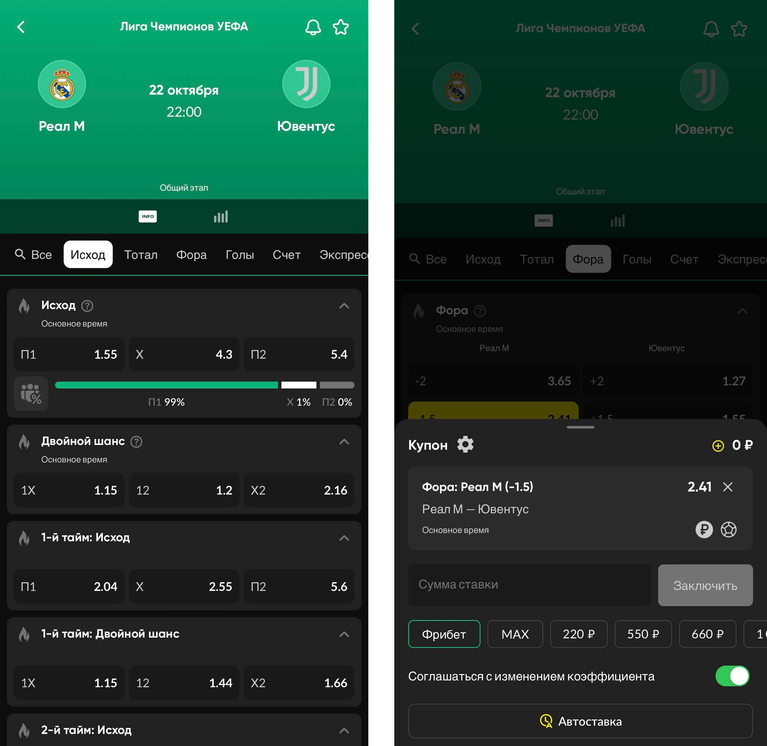 Пример. В матче «Реал» против «Ювентуса» вы поставили на Ф1 (-1,5). Для выигрыша ставки вам подойдет исход, при котором «Реал» победит с разницей, как минимум в два мяча. В случае, если вы выберите вариант с форой (+1,5) на «Реал», то для выигрыша пари хозяева должны не проиграть, либо уступить не более, чем в один мяч.